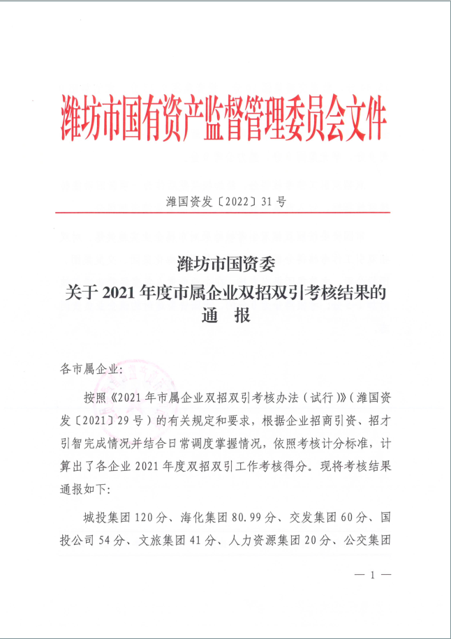 2021年,在市委、市政府正確領(lǐng)導(dǎo)和市國(guó)資委黨委的關(guān)心支持下,濰坊市國(guó)投公司全體干部職工上下一心,攻堅(jiān)克難,招商引資工作取得了突破性進(jìn)展。近日,市國(guó)資委印發(fā)《濰坊市國(guó)資委關(guān)于2021年度市屬企業(yè)雙招雙引考核結(jié)果的通報(bào)》(濰國(guó)資發(fā)﹝2022﹞31號(hào)),市國(guó)